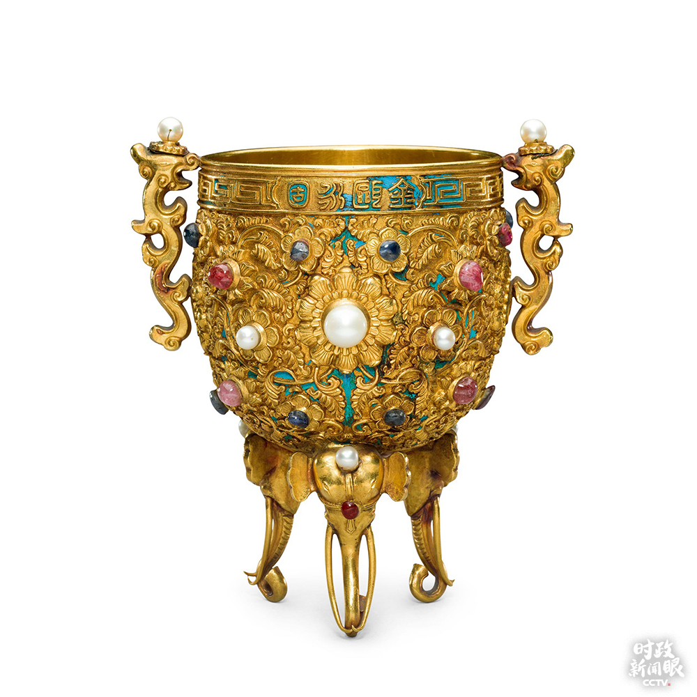 △正在故宮博物館展出的金嵌珠寶金甌永固杯,通體以點(diǎn)翠為地,造型優(yōu)美。(來源于故宮博物院官網(wǎng))