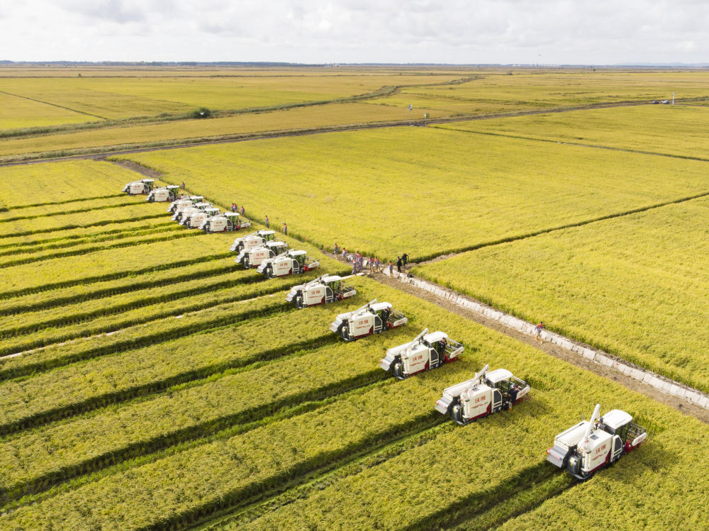 9月22日在黑龍江省富錦市萬畝水稻公園內拍攝的開鐮儀式現(xiàn)場(無人機照片)。新華社發(fā)(張濤攝)