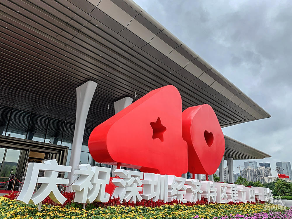 △“40”是慶祝大會當(dāng)天最醒目、設(shè)計最獨特的數(shù)字。4里面是一顆五角星,取自五星紅旗,0里面是一顆愛心,這個標(biāo)識的名字叫做“星心相映”,寓意著深圳是一顆明日之星,也是一座愛心之城。(總臺央視記者程鋮拍攝)