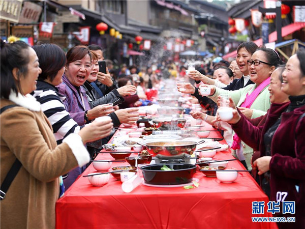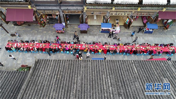 10月18日,游客在貴州省丹寨縣萬(wàn)達(dá)小鎮(zhèn)吃新節(jié)長(zhǎng)桌宴上品嘗佳肴。當(dāng)日,貴州省黔東南苗族侗族自治州丹寨縣萬(wàn)達(dá)小鎮(zhèn)舉辦苗族吃新節(jié)體驗(yàn)活動(dòng)。當(dāng)?shù)孛缱逋J笙舞、品長(zhǎng)桌宴,并邀請(qǐng)游客參與其中,大家在歡聲笑語(yǔ)中樂享金秋。新華社發(fā)(陸德華攝)