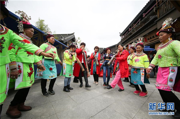 10月18日,游客在貴州省丹寨縣萬(wàn)達(dá)小鎮(zhèn)吃新節(jié)上體驗(yàn)苗族傳統(tǒng)蘆笙舞。當(dāng)日,貴州省黔東南苗族侗族自治州丹寨縣萬(wàn)達(dá)小鎮(zhèn)舉辦苗族吃新節(jié)體驗(yàn)活動(dòng)。當(dāng)?shù)孛缱逋J笙舞、品長(zhǎng)桌宴,并邀請(qǐng)游客參與其中,大家在歡聲笑語(yǔ)中樂享金秋。新華社發(fā)(黃曉海攝)