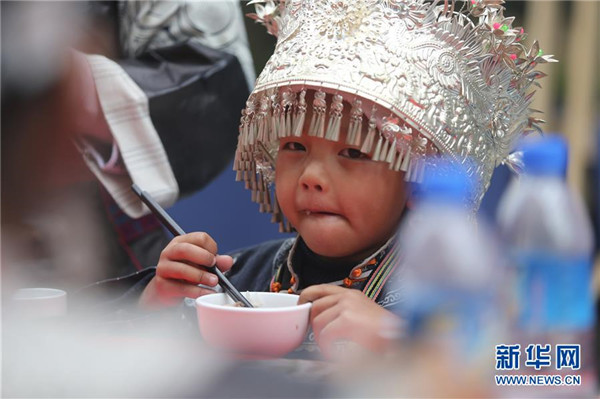 10月18日,一名小朋友在貴州省丹寨縣萬(wàn)達(dá)小鎮(zhèn)吃新節(jié)長(zhǎng)桌宴上品嘗佳肴。當(dāng)日,貴州省黔東南苗族侗族自治州丹寨縣萬(wàn)達(dá)小鎮(zhèn)舉辦苗族吃新節(jié)體驗(yàn)活動(dòng)。當(dāng)?shù)孛缱逋J笙舞、品長(zhǎng)桌宴,并邀請(qǐng)游客參與其中,大家在歡聲笑語(yǔ)中樂享金秋。新華社發(fā)(張暉攝)