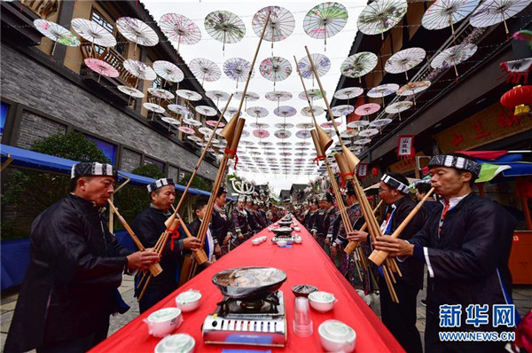 10月18日,苗族群眾在貴州省丹寨縣萬(wàn)達(dá)小鎮(zhèn)吃新節(jié)長(zhǎng)桌宴上助興。當(dāng)日,貴州省黔東南苗族侗族自治州丹寨縣萬(wàn)達(dá)小鎮(zhèn)舉辦苗族吃新節(jié)體驗(yàn)活動(dòng)。當(dāng)?shù)孛缱逋J笙舞、品長(zhǎng)桌宴,并邀請(qǐng)游客參與其中,大家在歡聲笑語(yǔ)中樂享金秋。新華社發(fā)(楊武魁攝)