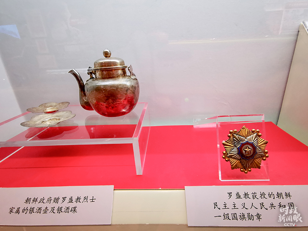 △左為朝鮮政府贈(zèng)給羅盛教烈士家屬的銀酒壺、銀酒碟,右為羅盛教獲授的朝鮮民主主義人民共和國(guó)一級(jí)國(guó)旗勛章。