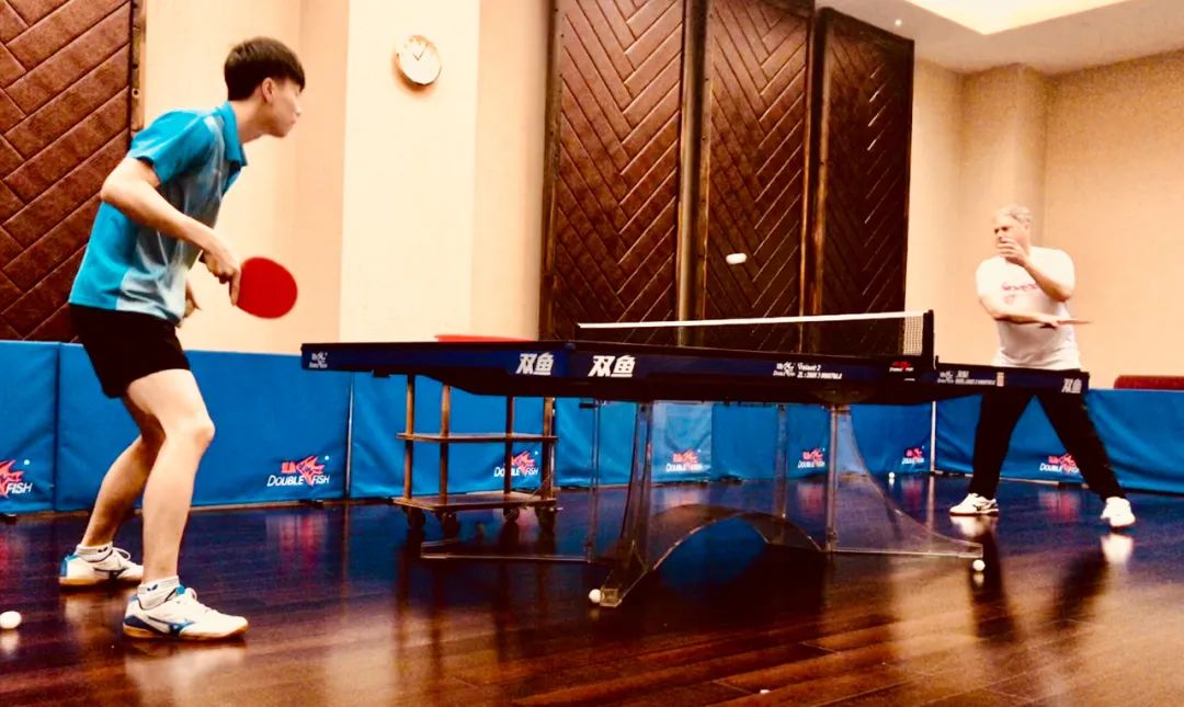 ▲ 資料圖片:喬希·塞利格(右)與中國(guó)乒乓球教練打球。圖由受訪者提供