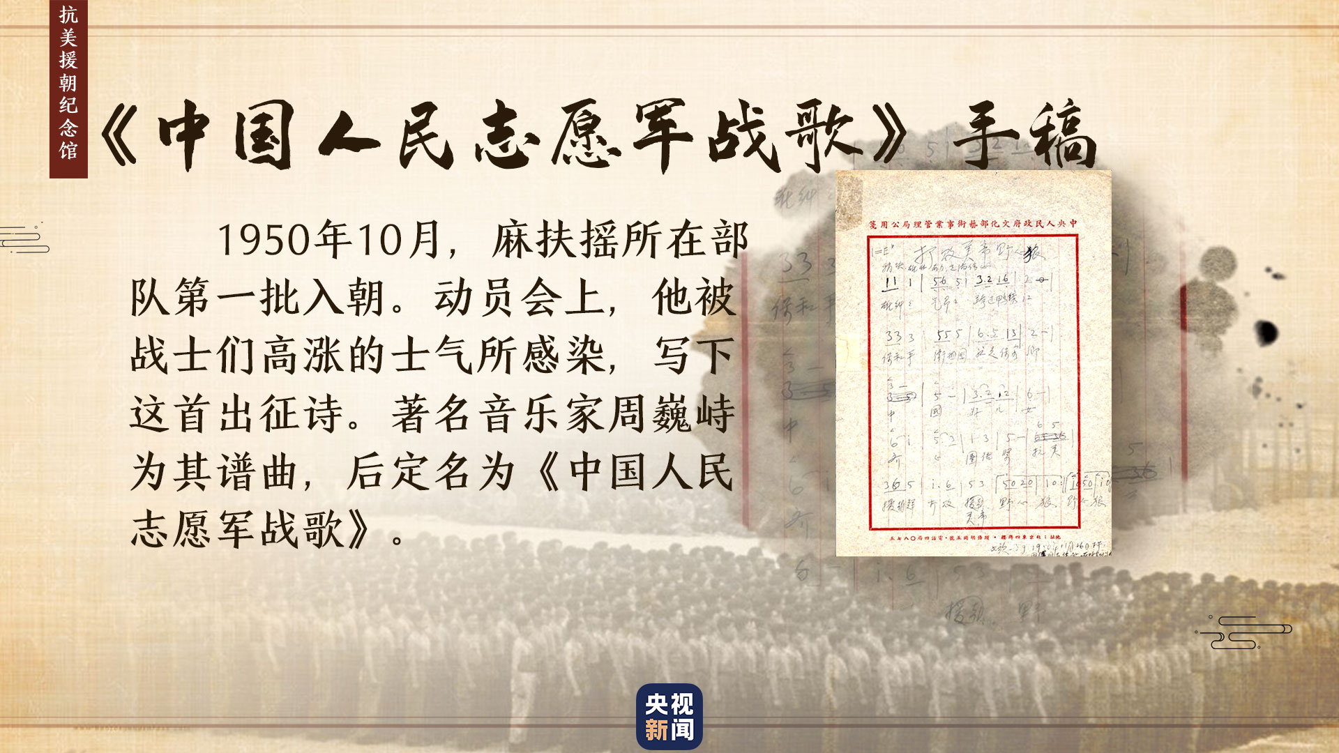 在此期間,有的刊物以《中國人民志愿軍部隊(duì)?wèi)?zhàn)歌》為題,轉(zhuǎn)發(fā)這首詩。周巍峙覺得很好,就將歌名定為《中國人民志愿軍戰(zhàn)歌》。