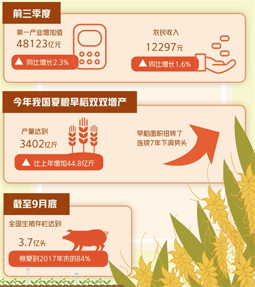 數據顯示,前三季度我國第一產業(yè)增加值48123億元,同比增長2.3%;農民收入12297元,同比增長1.6%。農業(yè)生產形勢較好,成為國民經濟運行的突出亮點,“三農”壓艙石作用更加凸顯,為穩(wěn)定經濟社會發(fā)展大局提供了有力支撐。