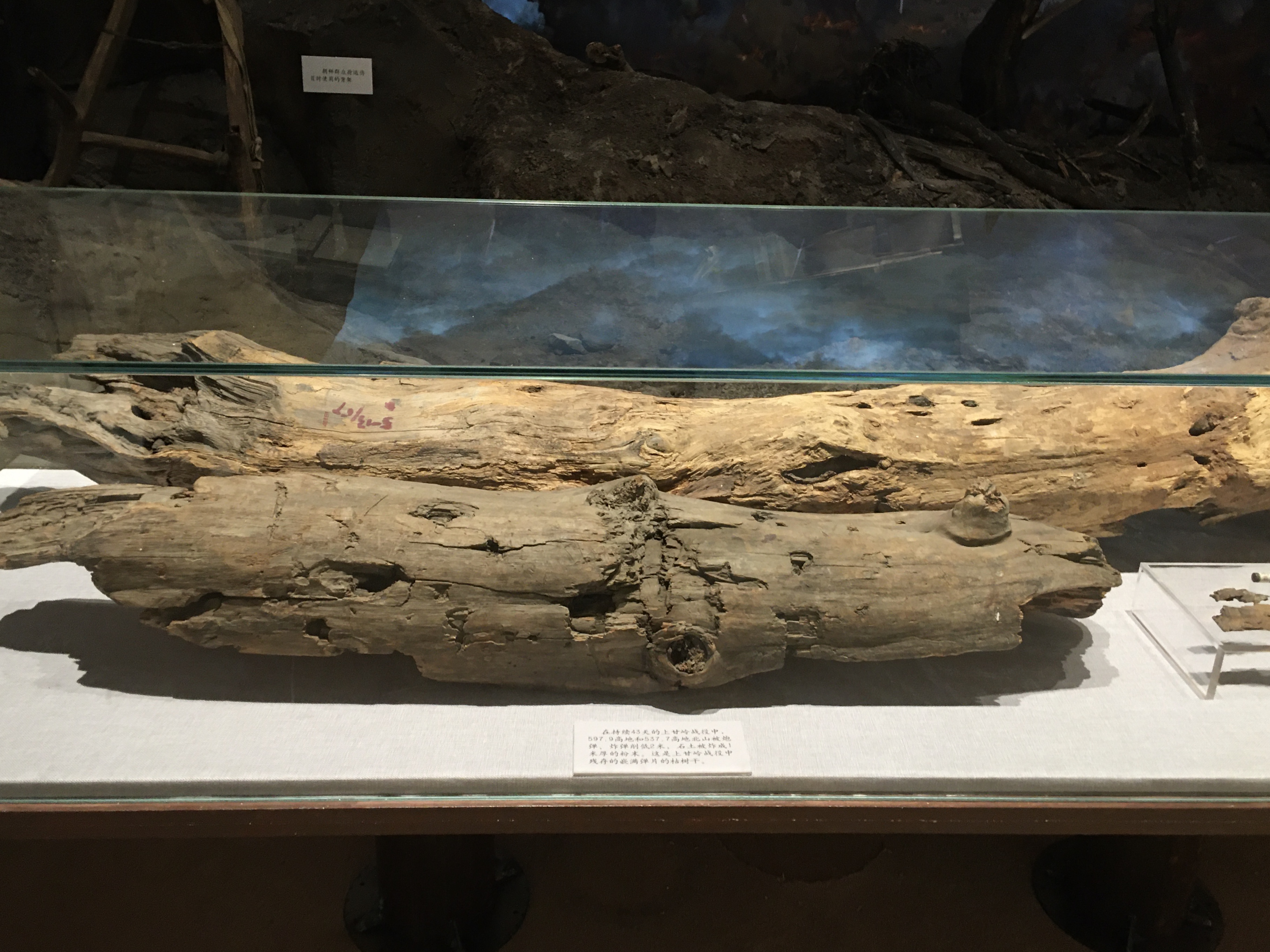 在軍博的主題展覽“血戰(zhàn)上甘嶺”展區(qū),幾件戰(zhàn)場實(shí)物似乎還能讓人聞到當(dāng)年的殘酷硝煙:一截嵌滿彈片的枯樹干,一堆摻雜著彈片的碎石焦土,被炸斷50多處的200多米電話線……