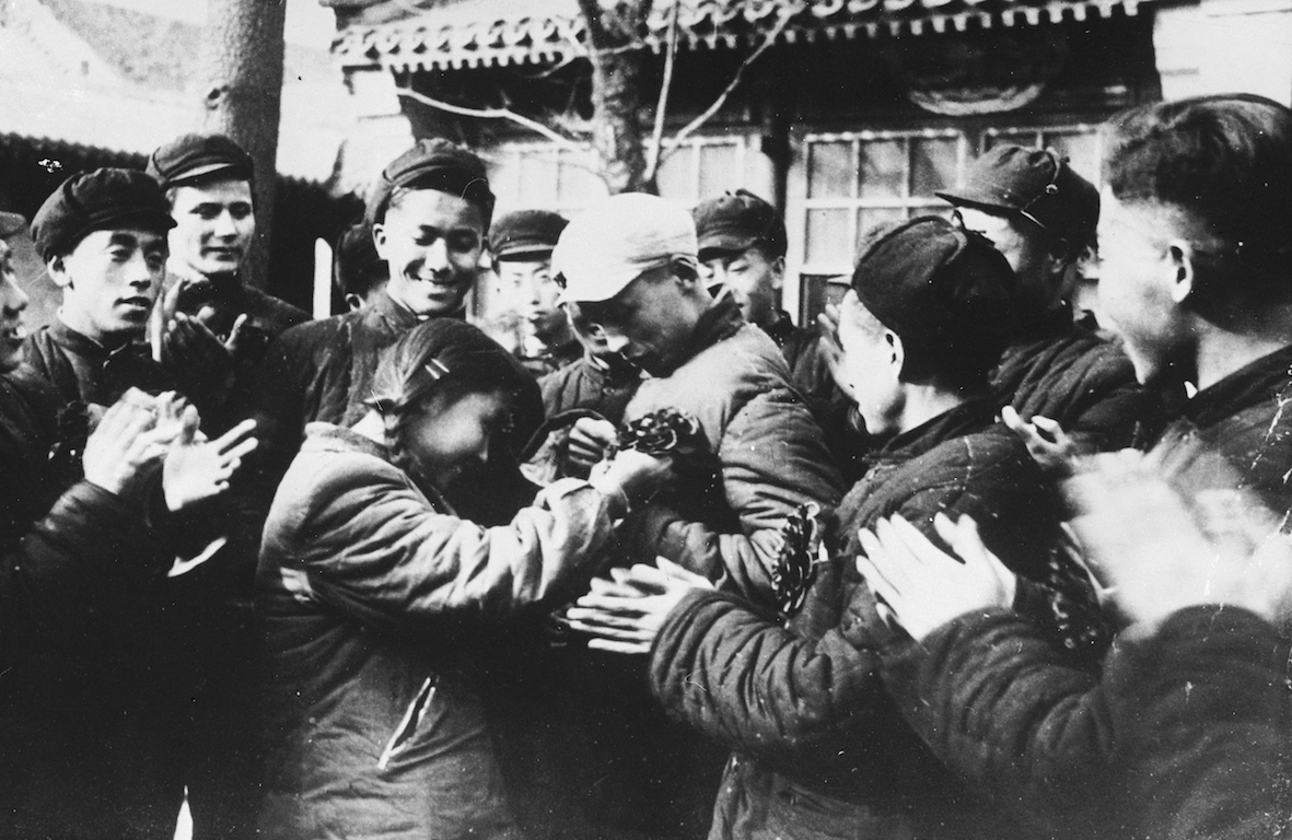 △1950年12月,北京,報名參加抗美援朝的學(xué)子被同學(xué)們戴上光榮花。