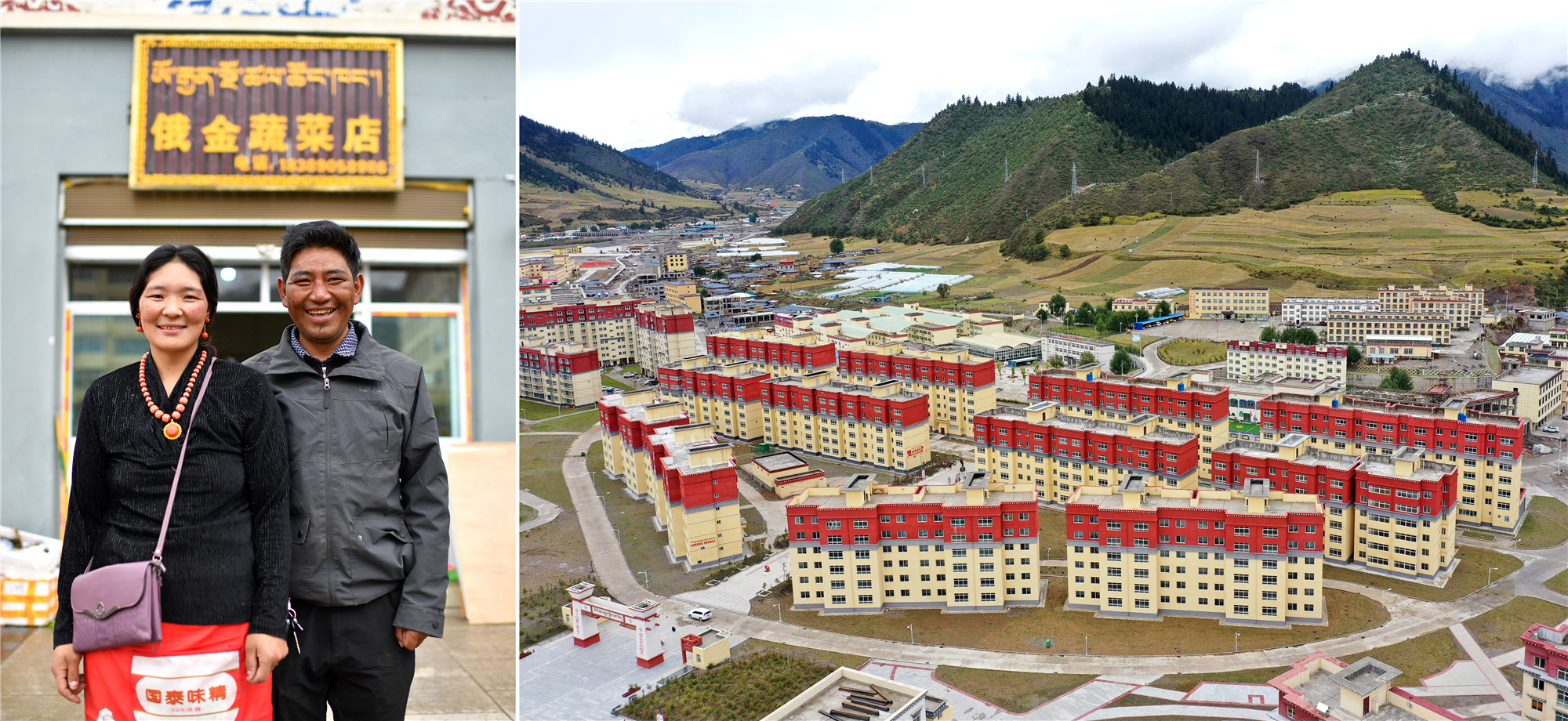 2020年9月22日拍攝的拼版照片:左圖為西藏自治區(qū)昌都市類烏齊縣長(zhǎng)毛嶺鄉(xiāng)達(dá)雄村村民俄金(右)和妻子阿丁在安置點(diǎn)俄金蔬菜店前;右圖為類烏齊縣桑多扶貧開發(fā)區(qū)易地扶貧搬遷安置點(diǎn)一角(無(wú)人機(jī)照片)。新華社記者 詹彥 攝