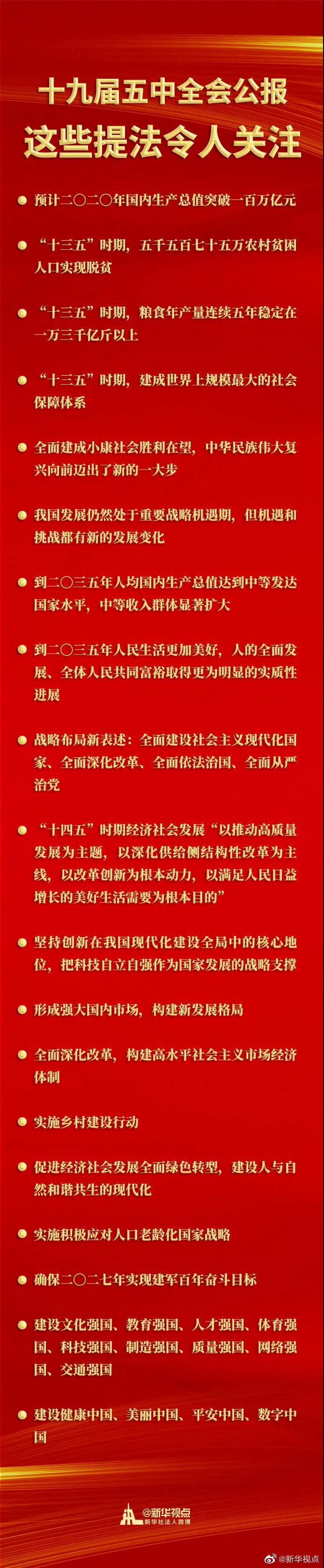 中國(guó)共產(chǎn)黨第十九屆中央委員會(huì)第五次全體會(huì)議,于2020年10月26日至29日在北京舉行。全會(huì)審議通過了《中共中央關(guān)于制定國(guó)民經(jīng)濟(jì)和社會(huì)發(fā)展第十四個(gè)五年規(guī)劃和二〇三五年遠(yuǎn)景目標(biāo)的建議》。