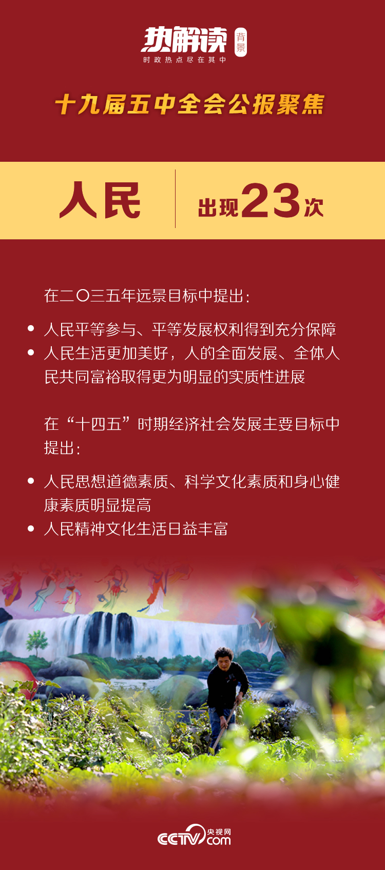 6000多字的公報中,“人民”一詞出現(xiàn)23次。“人民平等參與、平等發(fā)展權利得到充分保障”“人民精神文化生活日益豐富”“改善人民生活品質”“不斷增強人民群眾獲得感、幸福感、安全感”“提高人民收入水平”“保障人民生命安全”……字字句句,都圍繞著“人民”二字,映射出以習近平同志為核心的黨中央,率領9000多萬名中國共產黨員為人民謀幸福、為民族謀復興的奮斗圖景。