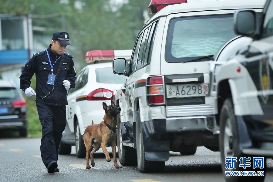 車輛搜爆項目中,警犬正在搜尋。新華網(wǎng)發(fā)