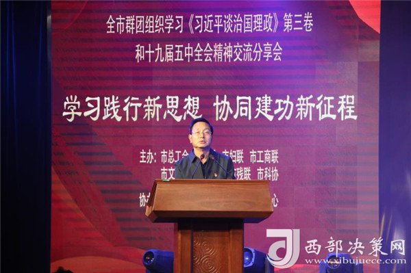 西部決策網(wǎng)訊 為深入貫徹習(xí)近平新時代中國特色社會主義思想,學(xué)習(xí)宣傳貫徹《習(xí)近平談治國理政》第三卷、黨的十九屆五中全會精神,加快群團協(xié)同化建設(shè)進程,11月5日,西寧市總工會牽頭召開市級群團組織“學(xué)習(xí)踐行新思想 協(xié)同建功新征程”為主題的學(xué)習(xí)《習(xí)近平談治國理政》第三卷和黨的十九屆五中全會精神交流分享會,市委常委、宣傳部部長、市總工會主席王霞出席會議并講話。全市各群團組織負責同志、勞模代表和干部職工群眾共300余人參加活動。