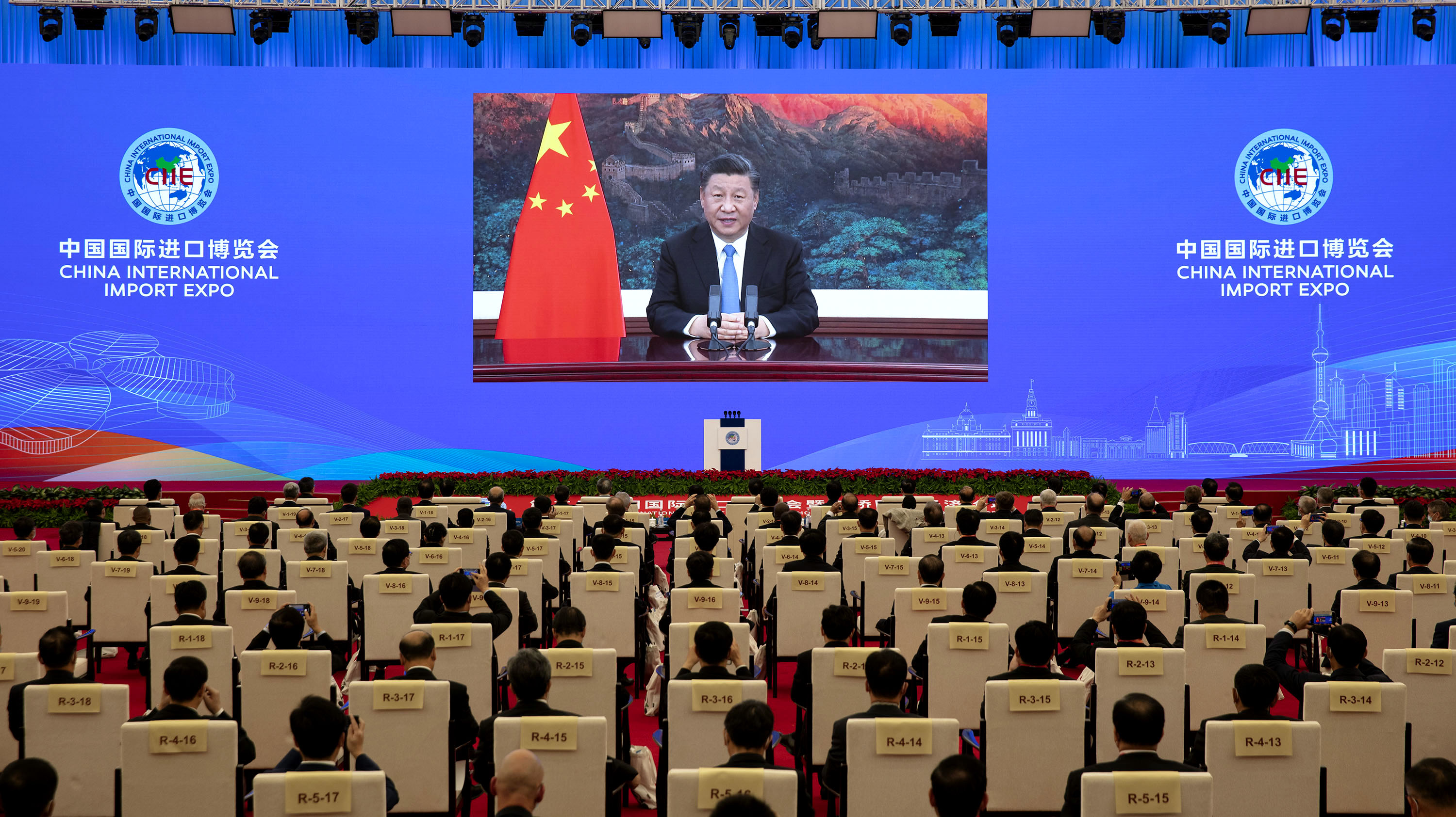11月4日晚,習近平在第三屆中國國際進口博覽會開幕式上以視頻方式發(fā)表主旨演講。新華社記者 黃敬文 攝