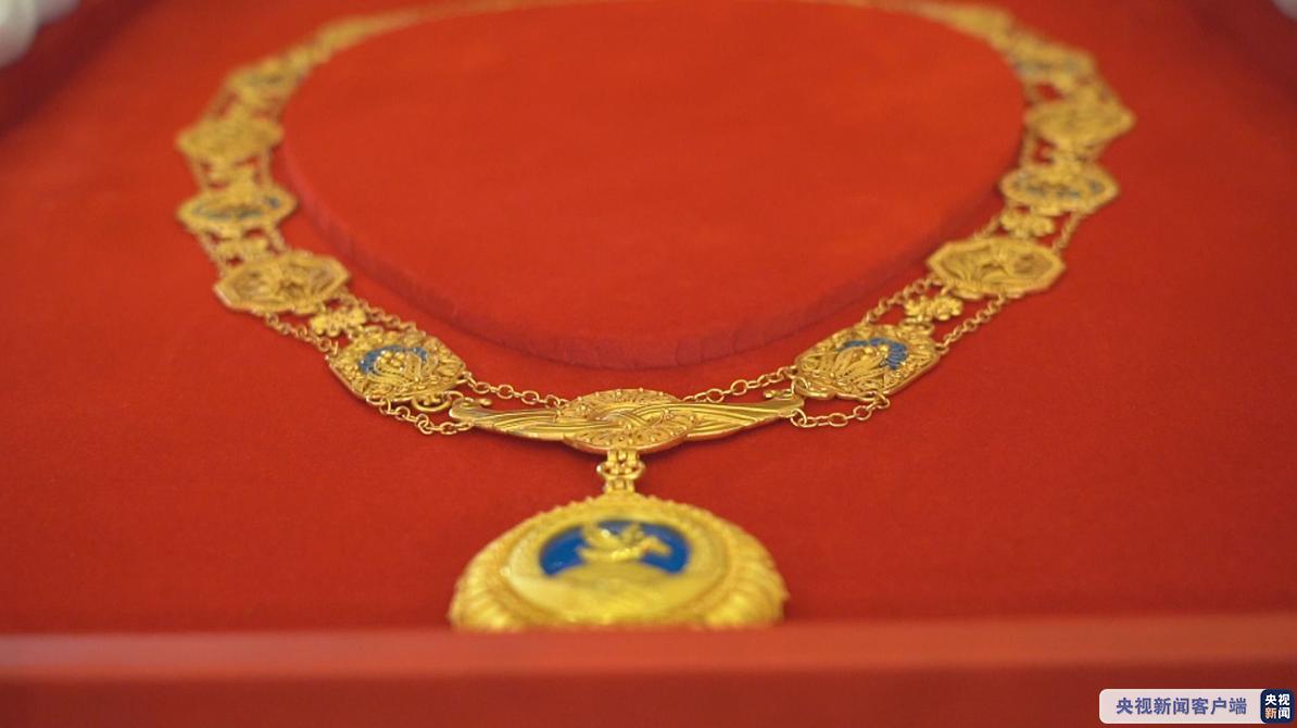 習(xí)近平鄭重為莫尼列配掛勛章。