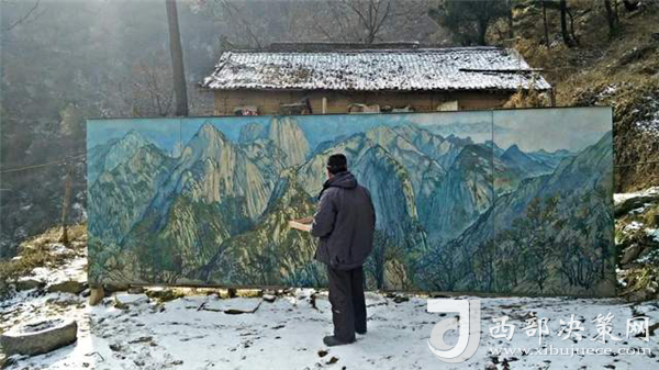 作品《神屏》,始于2013年春季寫生,東仰太華的清晨,主峰巍峨,山谷靜悄悄的,逆光下的高山統(tǒng)一在多層次的藍(lán)色調(diào)里,復(fù)雜的山石結(jié)構(gòu)則需要反反復(fù)復(fù)耐心的修改塑造,畫長三米九,高兩米。