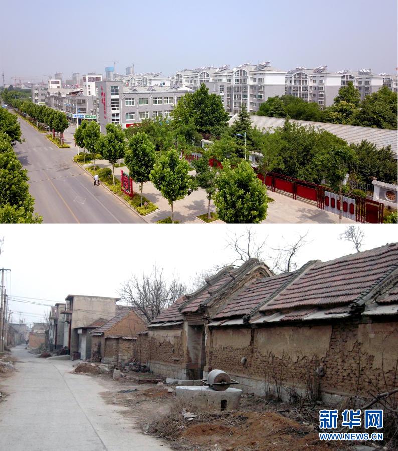 這是一張拼版照片。上圖為濟(jì)南市章丘區(qū)三澗溪村新貌(新華社記者郭緒雷6月10日攝,無人機(jī)照片);下圖為三澗溪村舊貌(資料照片)。新華社發(fā)