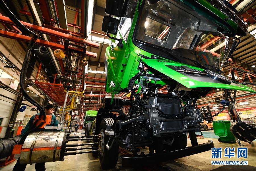 工人在位于濟(jì)南市章丘區(qū)的中國重汽集團(tuán)濟(jì)南商用車有限公司整車裝配生產(chǎn)線上作業(yè)(2018年1月25日攝)。新華社記者 郭緒雷 攝