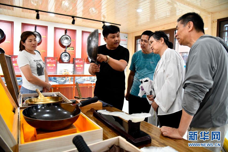 在濟(jì)南市章丘區(qū)三澗溪村美食街,游客在購買章丘鐵鍋(6月23日攝)。新華社記者 郭緒雷 攝