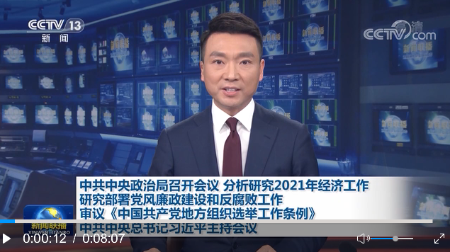 中共中央政治局12月11日召開(kāi)會(huì)議,分析研究2021年經(jīng)濟(jì)工作;聽(tīng)取中央紀(jì)委國(guó)家監(jiān)委工作匯報(bào),研究部署2021年黨風(fēng)廉政建設(shè)和反腐敗工作;審議《中國(guó)共產(chǎn)黨地方組織選舉工作條例》。中共中央總書(shū)記習(xí)近平主持會(huì)議。