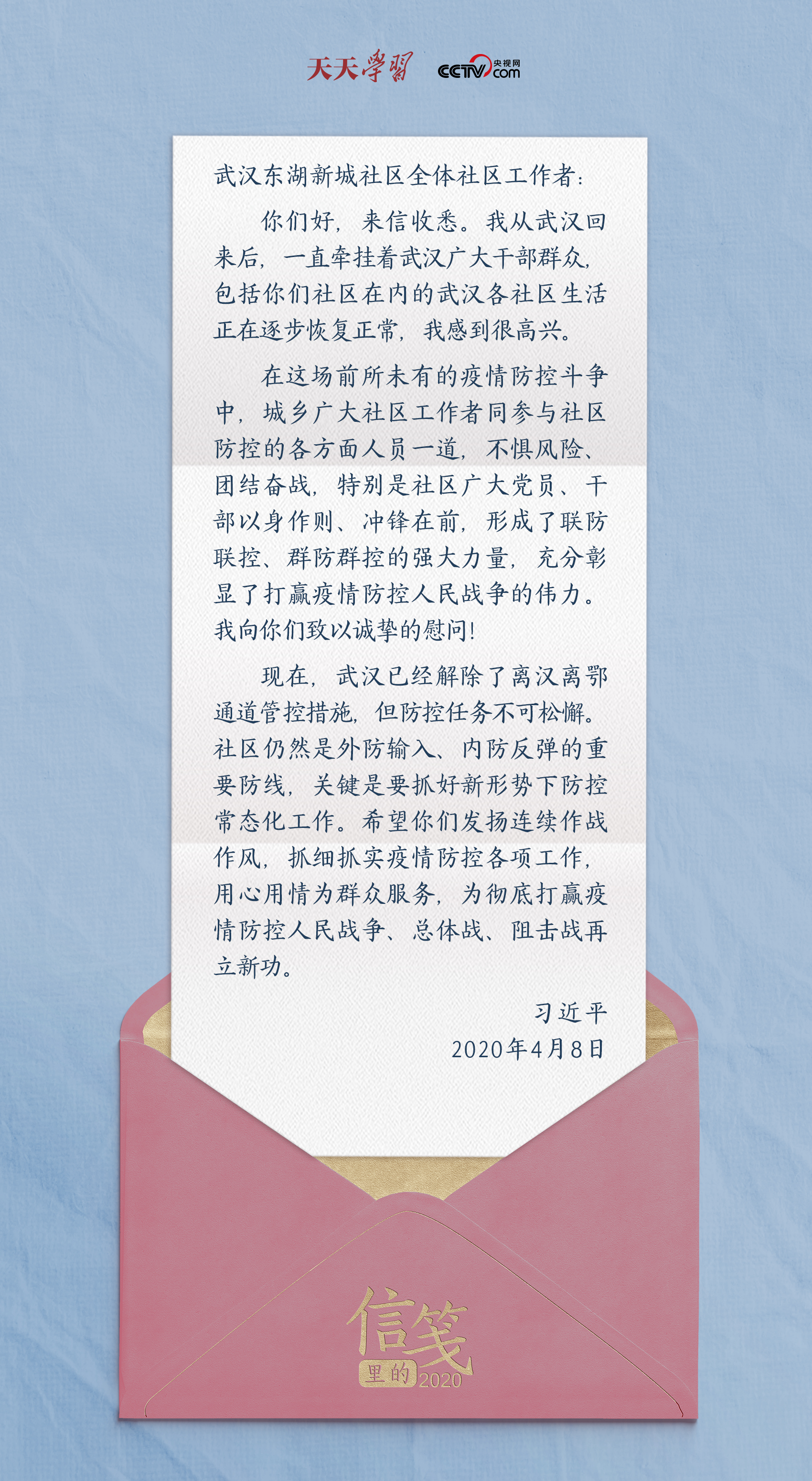 4月8日,武漢解封。在給武漢東湖新城社區(qū)全體社區(qū)工作者的回信中,總書記再次肯定城鄉(xiāng)廣大社區(qū)工作者在疫情防控斗爭中發(fā)揮的重要作用,并鼓勵他們“抓細抓實疫情防控各項工作,用心用情為群眾服務”,再立新功。