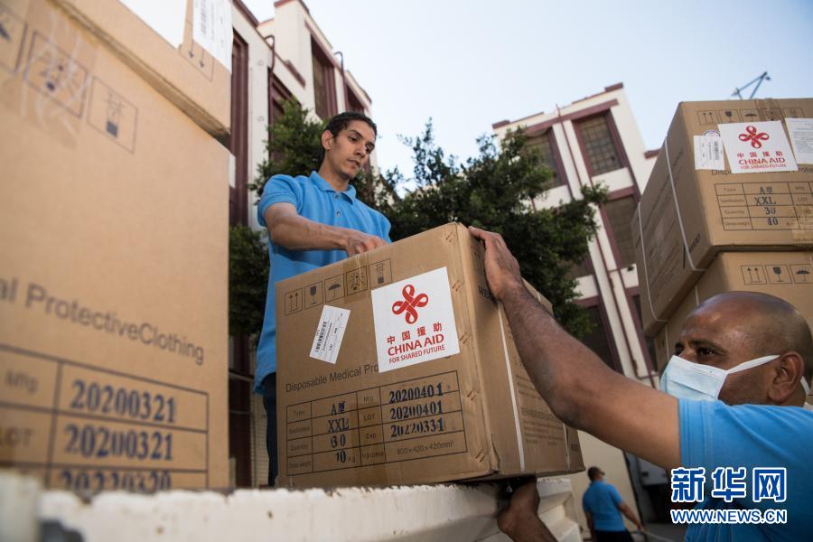 5月10日,在埃及首都開(kāi)羅,工作人員搬運(yùn)中國(guó)政府援助的第二批抗疫物資。新華社記者 鄔惠我 攝