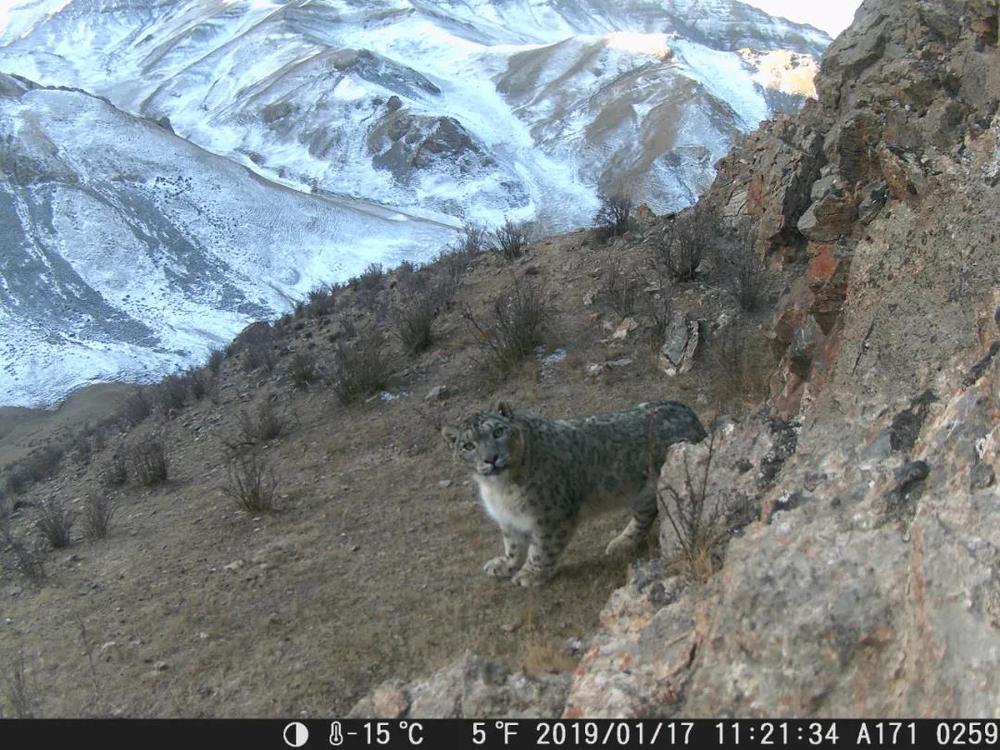 ↑2019年1月17日,在祁連山國家公園青海片區(qū),紅外相機(jī)拍攝到的雪豹照片。