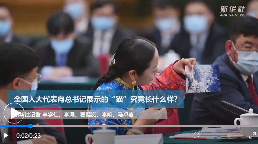 在會(huì)議現(xiàn)場,全國人大代表、青海省海北藏族自治州門源回族自治縣教育局教研室副主任孔慶菊拿出兩張照片,向習(xí)總書記展示了兩種可愛的“貓”。