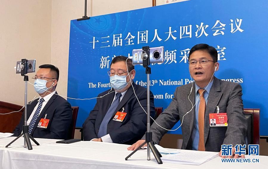 3月6日,全國(guó)人大代表在湖南代表團(tuán)駐地接受視頻采訪。新華社記者 熊爭(zhēng)艷 攝