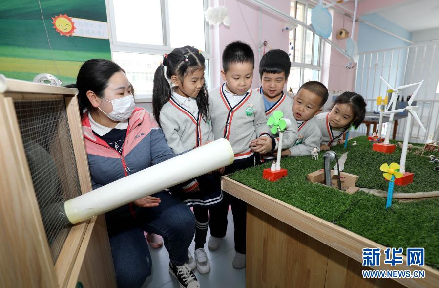 3月22日,在河北省石家莊市橋西區(qū)瑞特幼兒園,老師通過“風(fēng)的超能力”科普實驗,讓孩子們感受風(fēng)能的作用。新華社發(fā)(梁子棟 攝)