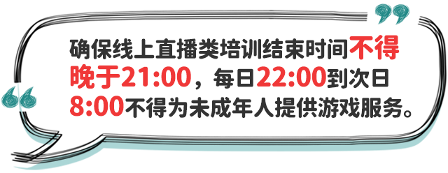 五、合理安排學生就寢時間。中小學校要指導家長和學生,制訂學生作息時間表,在保證學生睡眠時間要求前提下,結(jié)合學生個體睡眠狀況、午休時間等實際,合理確定學生晚上就寢時間,促進學生自主管理、規(guī)律作息、按時就寢。小學生就寢時間一般不晚于21:20;初中生一般不晚于22:00;高中生一般不晚于23:00。個別學生經(jīng)努力到就寢時間仍未完成作業(yè)的,家長應督促按時就寢不熬夜,確保充足睡眠;教師應有針對性幫助學生分析原因,加強學業(yè)輔導,提出改進策略,如有必要可調(diào)整作業(yè)內(nèi)容和作業(yè)量。各地教育部門要會同相關部門切實加強對轄區(qū)內(nèi)注冊登記或備案的線上培訓網(wǎng)課平臺、網(wǎng)絡游戲的規(guī)范管理,采取技術手段進行監(jiān)管,確保線上直播類培訓活動結(jié)束時間不得晚于21:00,每日22:00到次日8:00不得為未成年人提供游戲服務。