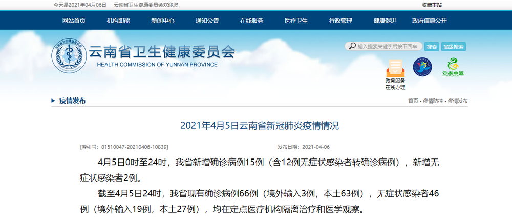 截至4月5日24時,我省現(xiàn)有確診病例66例(境外輸入3例,本土63例),無癥狀感染者46例(境外輸入19例,本土27例),均在定點醫(yī)療機構(gòu)隔離治療和醫(yī)學(xué)觀察。