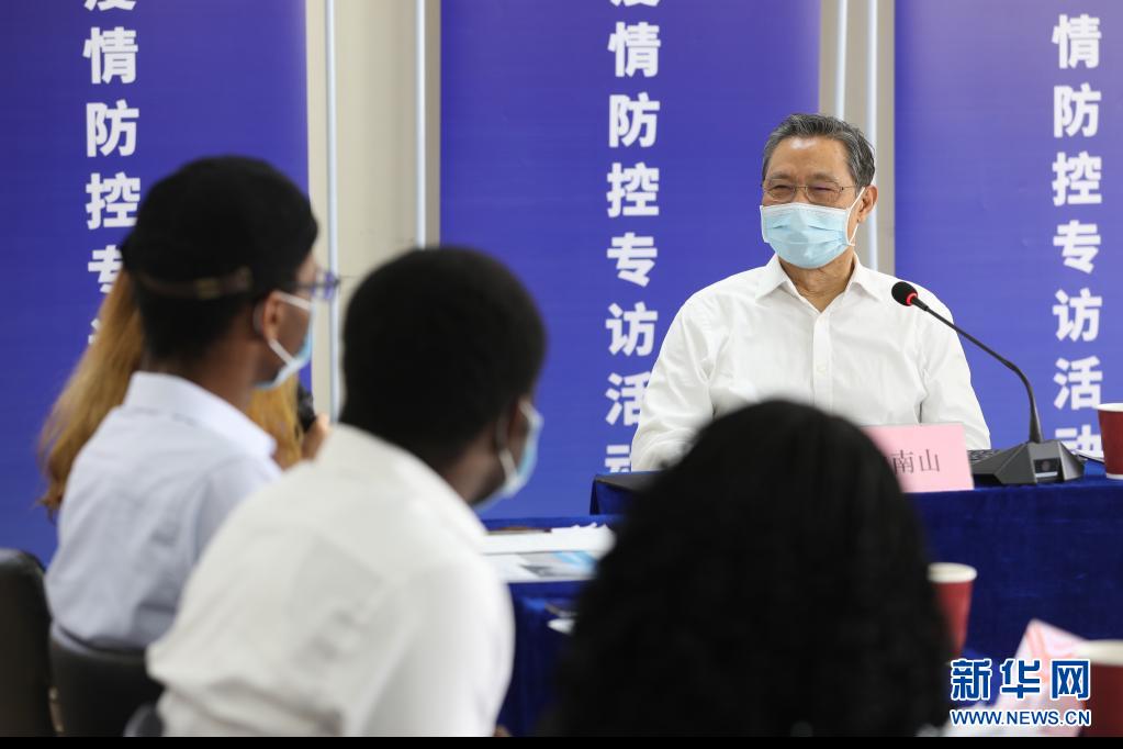 2020年4月15日,廣州市人民政府新聞辦公室在廣州醫(yī)科大學(xué)舉辦廣州市第78場(chǎng)疫情防控新聞采訪活動(dòng),鐘南山與在穗工作學(xué)習(xí)的外籍人士代表進(jìn)行座談交流。新華社記者 李嘉樂 攝