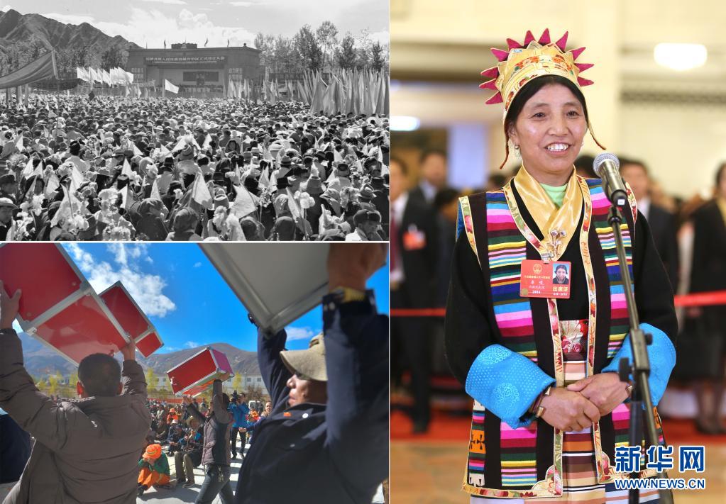這是一張拼版照片:左上圖為1965年9月9日,拉薩各界各族人民三萬多人舉行集會(huì)游行,熱烈慶祝西藏自治區(qū)正式成立(新華社記者馬競(jìng)秋攝);左下圖為拉薩市柳梧新區(qū)管委會(huì)柳梧鄉(xiāng)柳梧村換屆選舉工作人員展示投票箱(2014年10月29日新華社記者普布扎西攝);右圖為2018年3月11日,十三屆全國(guó)人大一次會(huì)議在北京人民大會(huì)堂舉行第三次全體會(huì)議,全國(guó)人大代表卓嘎在“代表通道”接受采訪(新華社記者金立旺攝)。新華社發(fā)