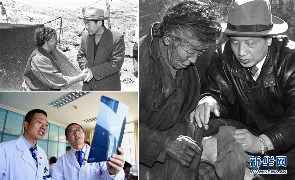 這是一張拼版照片:左上圖為來自陜西的援藏干部阿里日土縣副縣長(zhǎng)賈冗勇深入牧區(qū),幫助藏族牧民解決生產(chǎn)、生活的實(shí)際困難(新華社記者土登攝 1997年11月11日發(fā));左下圖為2017年8月3日,北京積水潭醫(yī)院援藏醫(yī)生龔曉峰(右)和北京天壇醫(yī)院援藏醫(yī)生李家謀在拉薩市人民醫(yī)院骨科病房?jī)?nèi)查看患者的X光片,進(jìn)行工作交接(新華社記者晉美多吉攝);右圖為孔繁森(右)在阿里日土縣過巴鄉(xiāng)為孤寡老人益西卓瑪治?。ㄐ氯A社記者土登攝 1994年12月26日發(fā))。新華社發(fā)