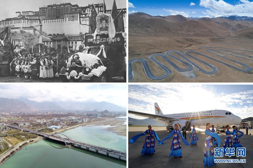 這是一張拼版照片:左上圖為1954年12月25日,康藏(今川藏)、青藏兩條公路通車儀式在布達(dá)拉宮前舉行(資料照片);左下圖為橫跨在拉薩河上的拉薩市區(qū)公路(2019年4月3日新華社記者晉美多吉攝,無人機(jī)照片);右上圖為通往珠峰的公路(2017年5月19日新華社記者 普布扎西攝);右下圖為西藏航空有限公司成立并舉行首航儀式(2011年7月26日新華社記者覺果攝)。新華社發(fā)