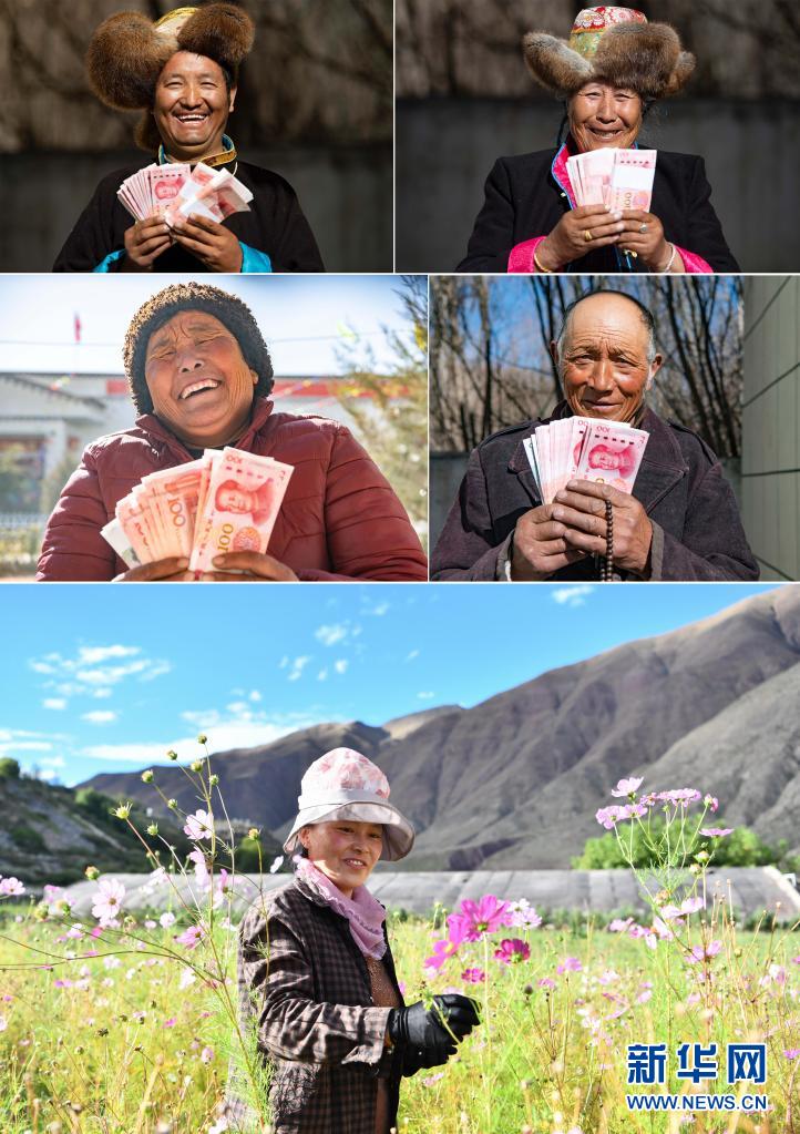 這是一張拼版照片:上四圖為2021年2月9日,山南市乃東區(qū)克松社區(qū)領(lǐng)到分紅的農(nóng)民興高采烈(新華社記者普布扎西攝);下圖為西藏昌都市察雅縣卡貢村村民在當(dāng)?shù)孛缙援a(chǎn)業(yè)基地采集鮮花種子,曾經(jīng)的建檔立卡貧困戶在這里實(shí)現(xiàn)了就業(yè),完成了脫貧(2020年9月28日 新華社記者晉美多吉攝)。新華社發(fā)