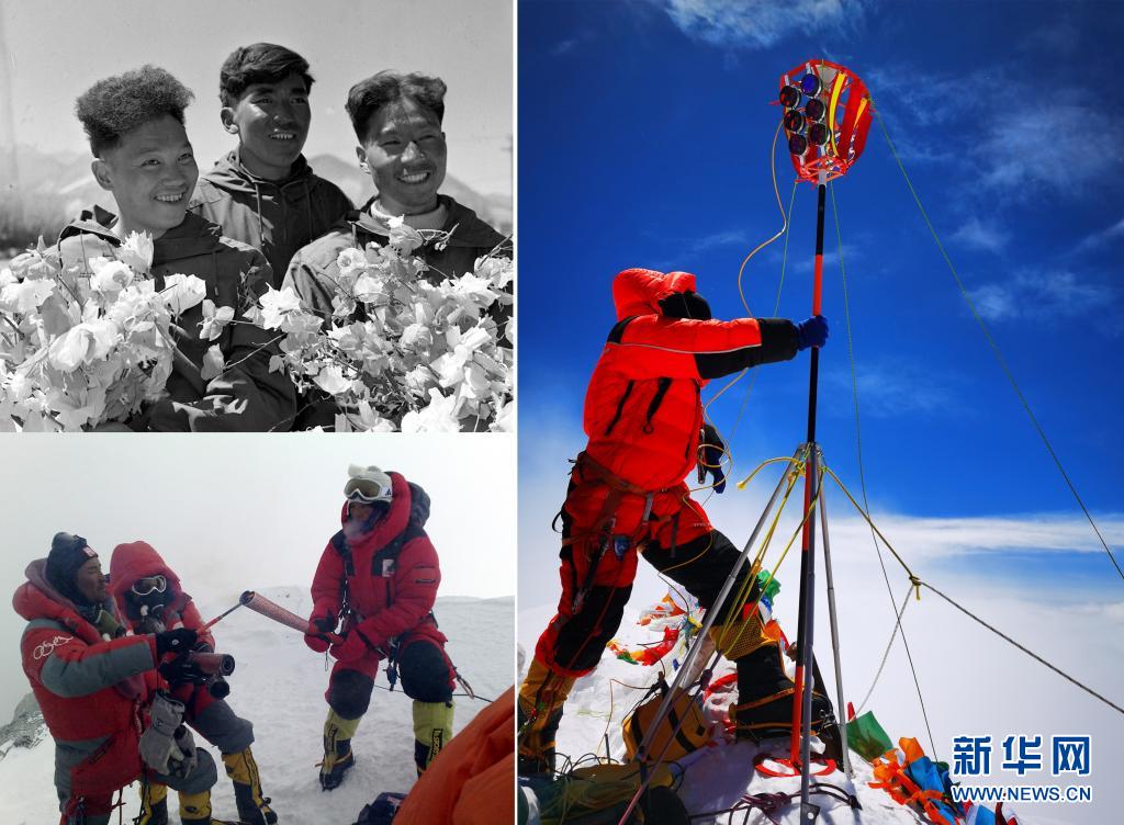 這是一張拼版照片:左上圖為1960年5月登上珠穆朗瑪峰頂?shù)闹袊?guó)登山隊(duì)隊(duì)員王富洲(右)、貢布(中)和屈銀華(資料照片 新華社發(fā));左下圖為2008年5月8日,北京奧運(yùn)圣火珠峰傳遞登山隊(duì)隊(duì)員羅布占堆(左)點(diǎn)燃第一棒火炬手吉吉手中的“祥云”火炬(新華社發(fā));右圖為2020珠峰高程測(cè)量登山隊(duì)隊(duì)員在珠穆朗瑪峰峰頂開展測(cè)量工作(2020年5月27日新華社特約記者扎西次仁攝)。新華社發(fā)