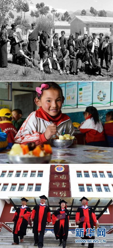 這是一張拼版照片:上圖為拉薩中學(xué)的應(yīng)屆畢業(yè)生在校園里練歌,準(zhǔn)備參加畢業(yè)典禮(新華社記者任用昭攝);中圖為一名藏族女孩在西藏雙湖縣嘎措鄉(xiāng)小學(xué)內(nèi)享受“三包”(包吃、包住、包學(xué)習(xí)費(fèi)用)政策(2014年6月29日新華社記者普布扎西攝);下圖為2017年11月10日,西藏大學(xué)舉行首屆博士研究生畢業(yè)典禮,向4名畢業(yè)生授予博士學(xué)位。這4名博士分別來自藏族歷史專業(yè)、藏語(yǔ)言文學(xué)專業(yè)及高原醫(yī)學(xué)專業(yè)(新華社記者覺果攝)。新華社發(fā)