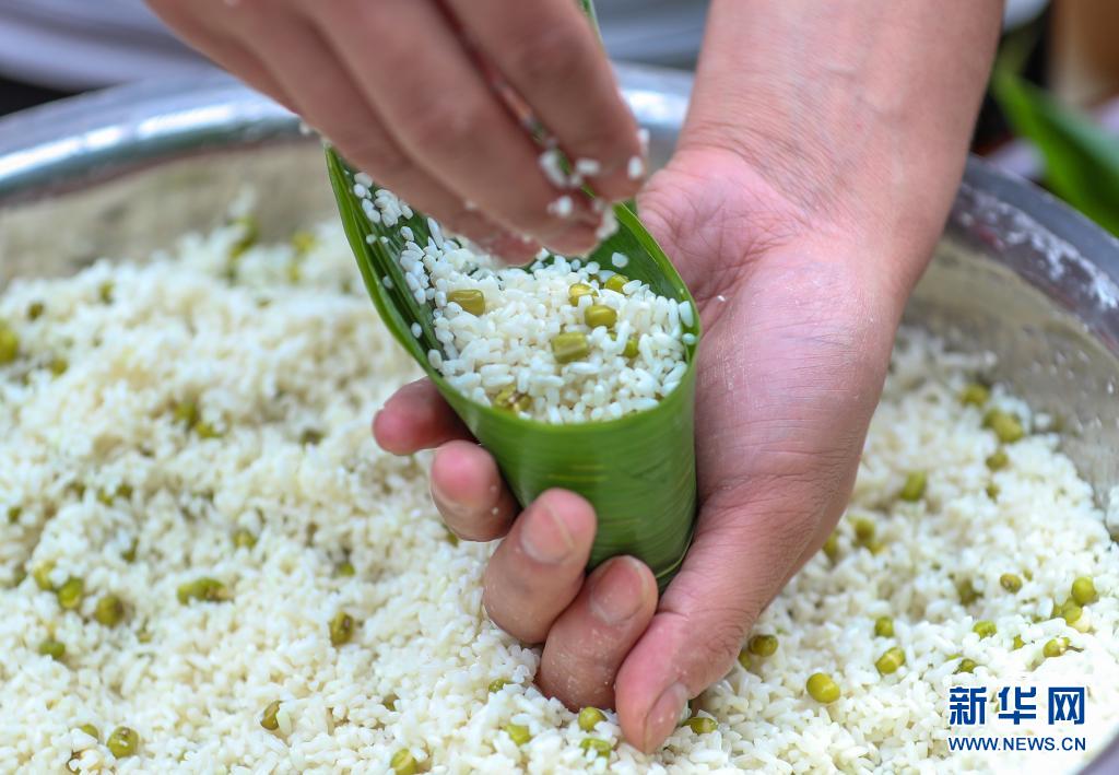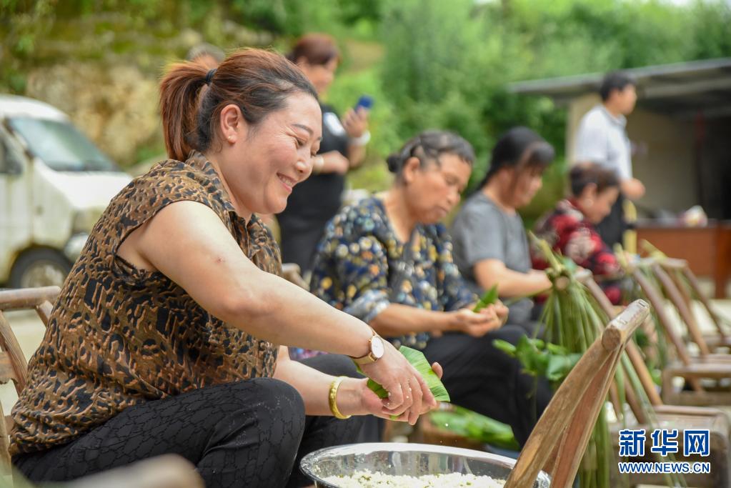 6月2日,貴州省銅仁市玉屏侗族自治縣亞魚鄉(xiāng)郭家灣村村民參加包粽子比賽。新華社發(fā)(胡攀學(xué)攝)