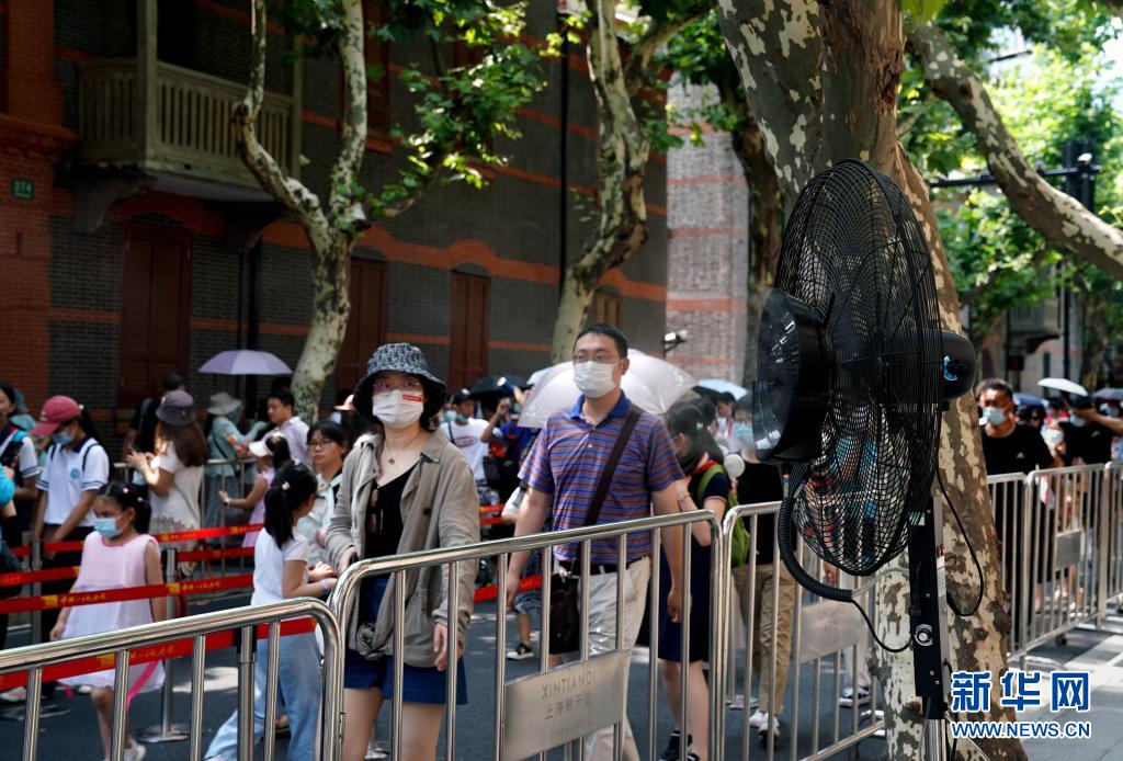 中共一大紀(jì)念館在觀眾排隊(duì)通道設(shè)置多個(gè)噴霧風(fēng)扇用于降溫(7月11日攝)。新華社記者 劉穎 攝