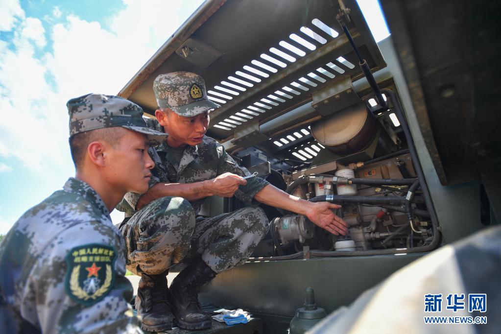 戰(zhàn)略支援部隊某大隊一級軍士長高玉華(右)現(xiàn)場指導(dǎo)排除工程機(jī)械故障(7月23日攝)。新華社記者 陳澤國 攝