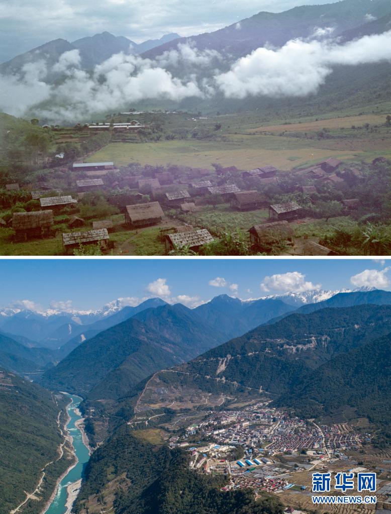 拼版照片:上圖是20世紀(jì)80年代的墨脫縣景色(新華社記者才龍攝);下圖是2021年2月13日拍攝的墨脫縣風(fēng)光(新華社記者孫非攝,無人機(jī)照片)。新華社發(fā)