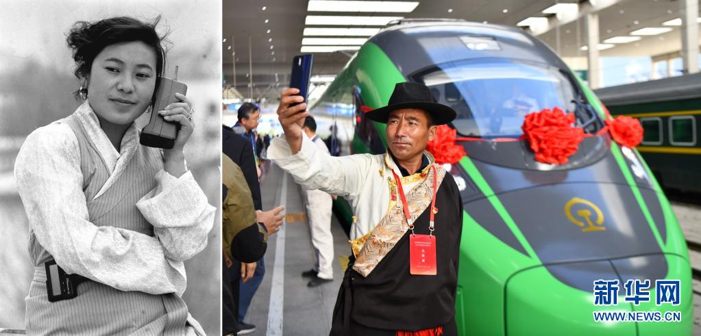 拼版照片:左圖是1994年,腰掛BP機(jī)、手持“大哥大”的藏族女商人拉珍和四川的客戶洽談生意(新華社記者土登攝);右圖是2021年6月25日,乘客與西藏首條電氣化鐵路拉林鐵路上的復(fù)興號列車自拍合影(新華社記者晉美多吉攝)。新華社發(fā)