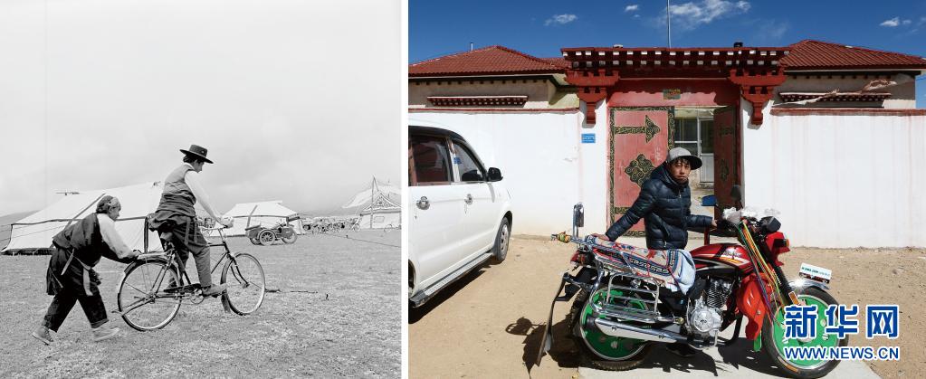 拼版照片:左圖是20世紀(jì)80年代,西藏聶榮縣牧民在騎自行車(新華社發(fā) 巴桑攝);右圖是2017年2月23日,那曲市聶榮縣牧民家的孩子在自家門前擺弄摩托車(新華社記者覺果攝)。新華社發(fā)