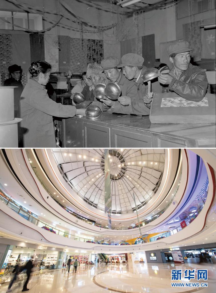 拼版照片:上圖是20世紀(jì)80年代,人們在拉薩一家商店購物(新華社發(fā) 劉麗嘉攝);下圖是2021年8月15日,人們在拉薩市萬達(dá)廣場購物(新華社記者孫非攝)。新華社發(fā)