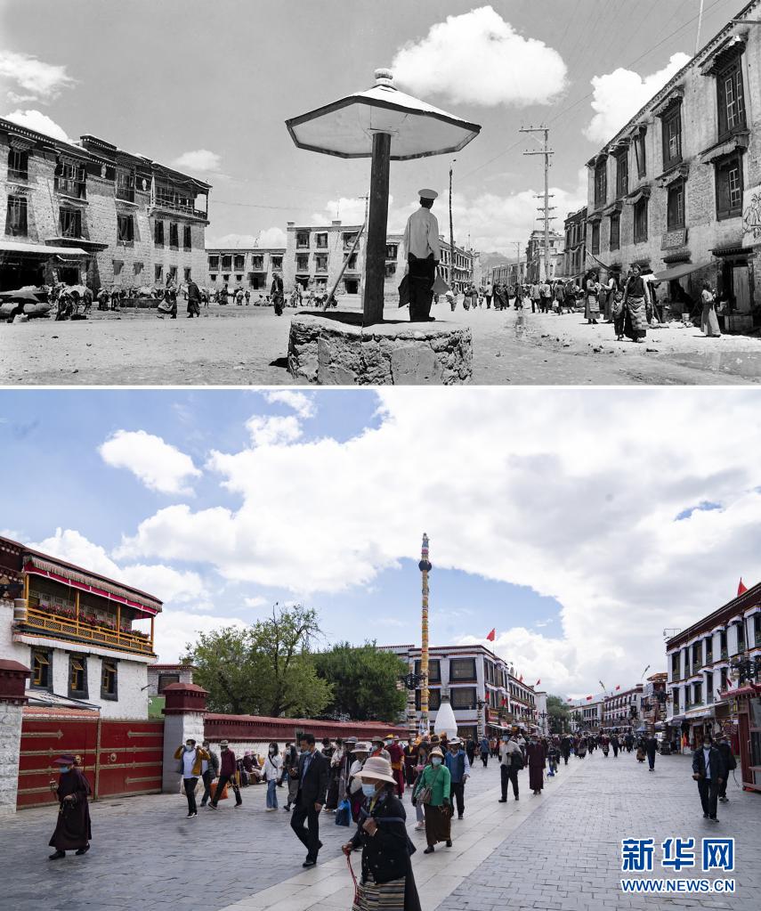 拼版照片:上圖是1959年拍攝的拉薩八廓街(新華社記者王純德攝);下圖是2021年8月13日拍攝的八廓街(新華社記者普布扎西攝)。新華社發(fā)