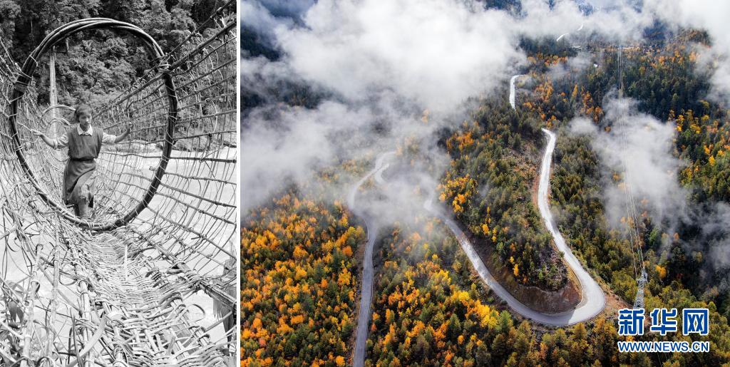 拼版照片:左圖是墨脫縣雅魯藏布江上的籐橋(20世紀(jì)80年代資料照片,新華社記者顧綬康攝);右圖是2020年11月5日拍攝的派墨公路米林段公路(新華社發(fā) 董志雄攝)。新華社發(fā)