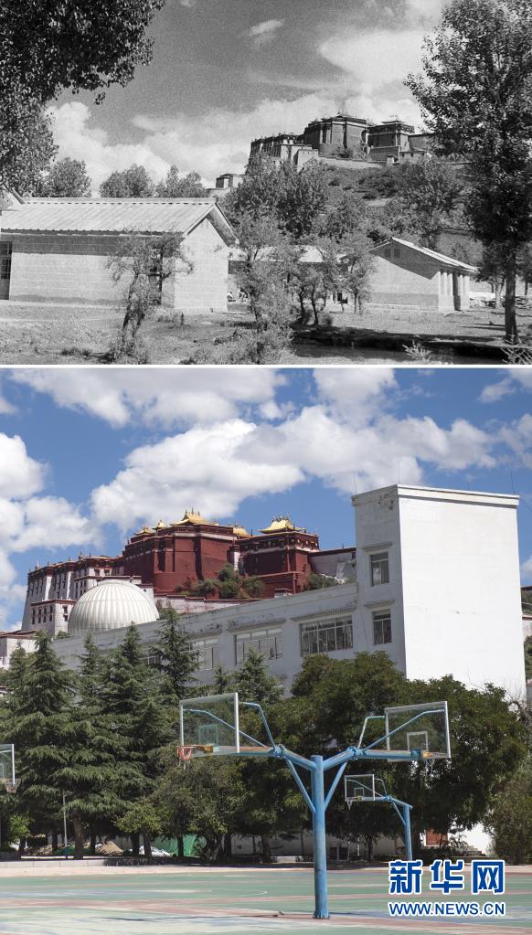 拼版照片:上圖是20世紀(jì)50年代拍攝的西藏第一所現(xiàn)代正規(guī)初級中學(xué)——拉薩中學(xué)一角(新華社記者景家棟攝);下圖是2021年8月9日拍攝的拉薩中學(xué)一角(新華社記者孫瑞博攝)。新華社發(fā)